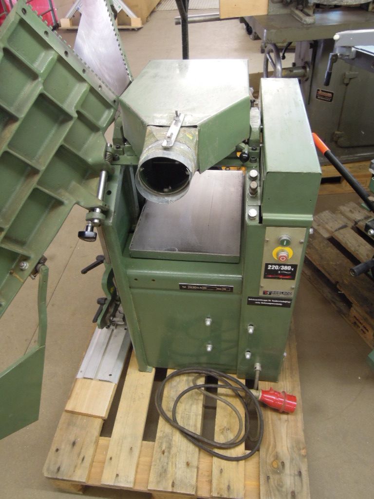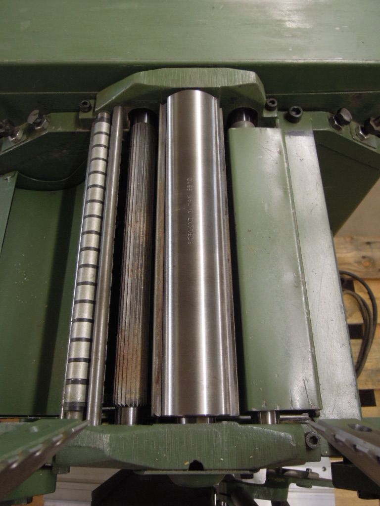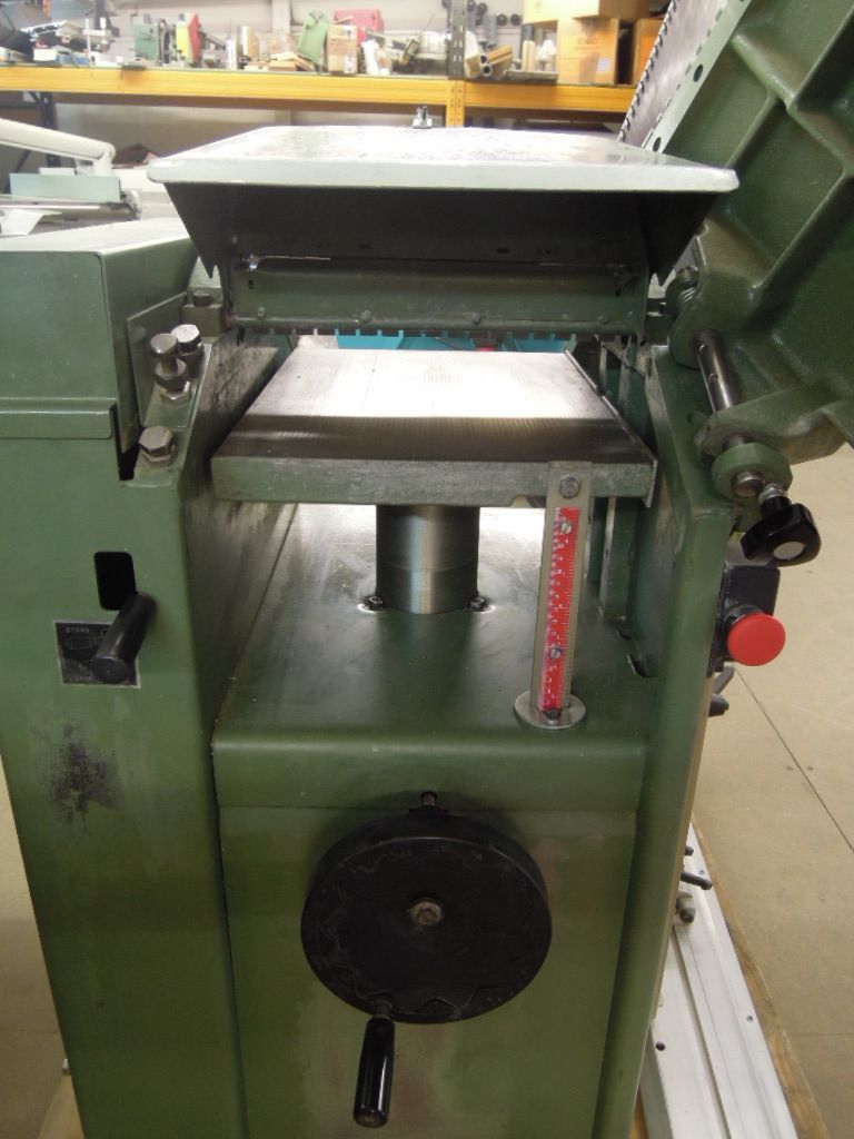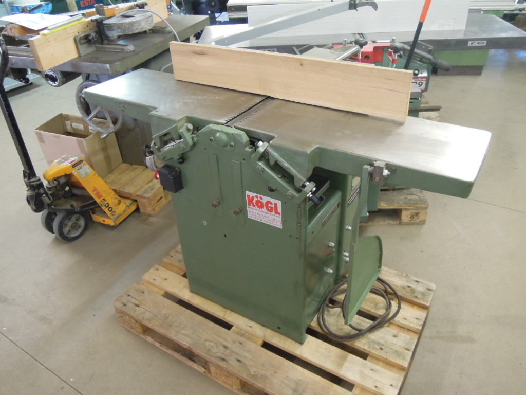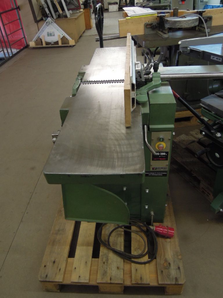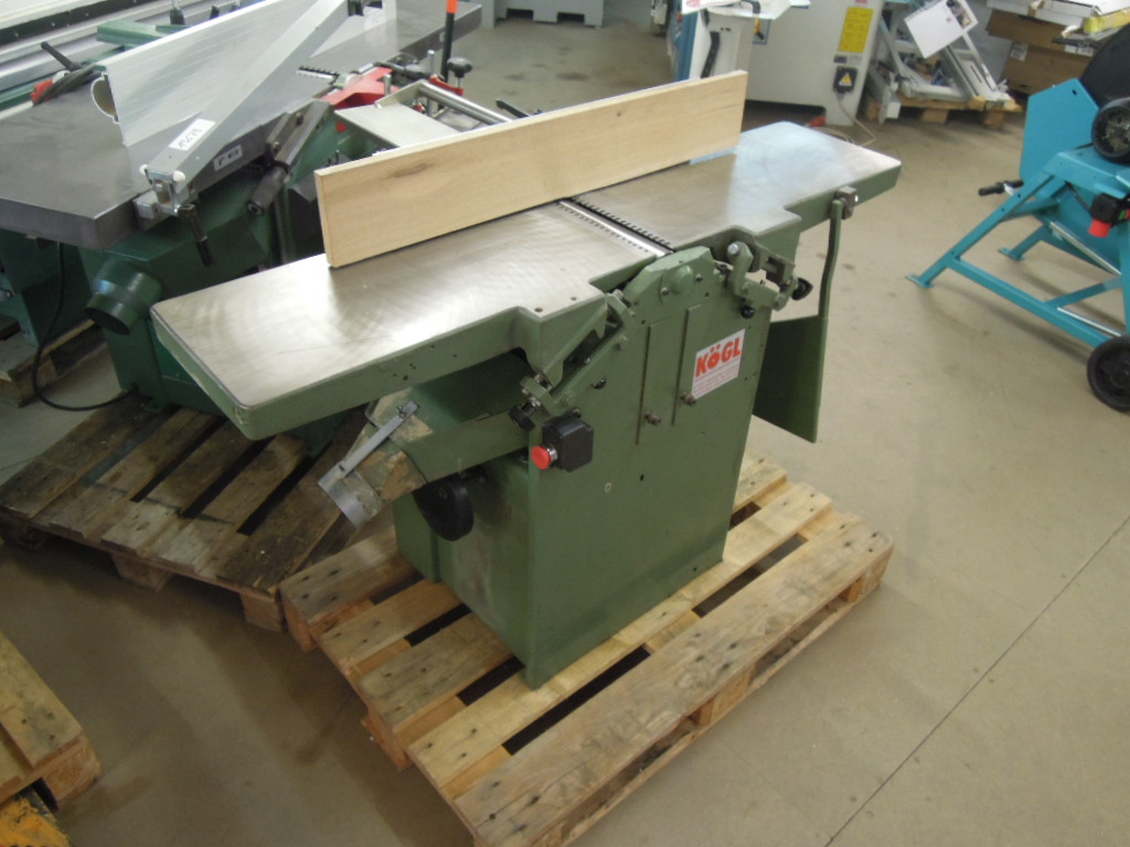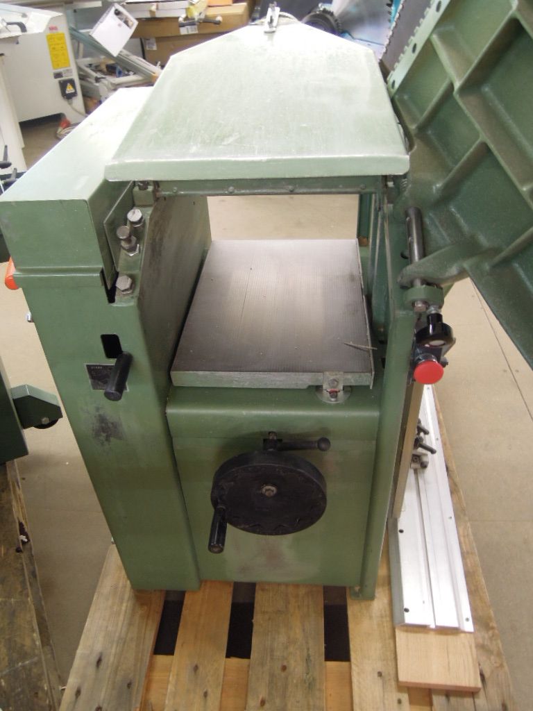 Kombinierte Abricht- Dickenhobelmaschine, mit schwenkbarem Abricthanschlag. Pendelschutzhaube über der Messerwelle. Messer mit 3 Streifenhobelmsssern