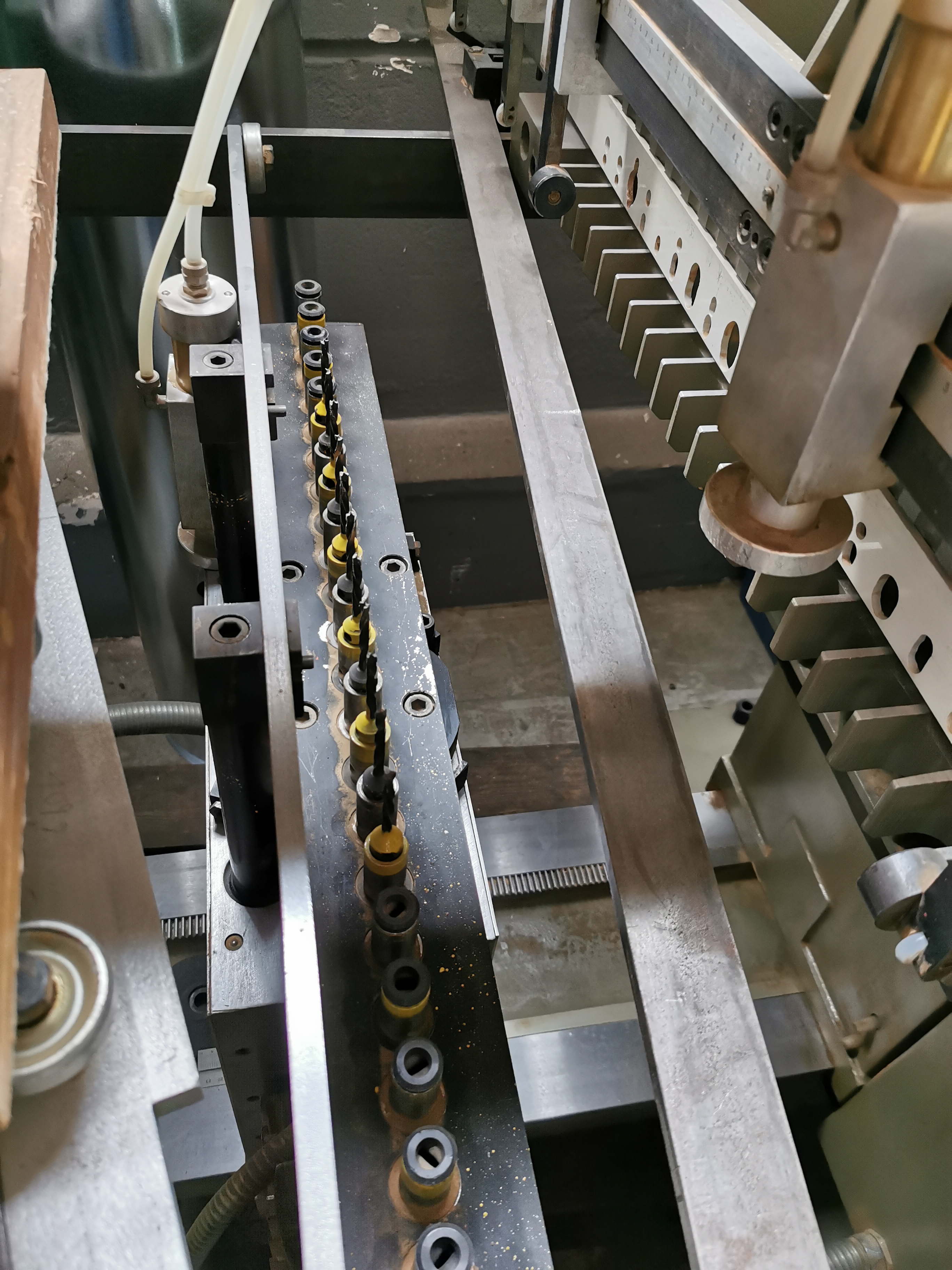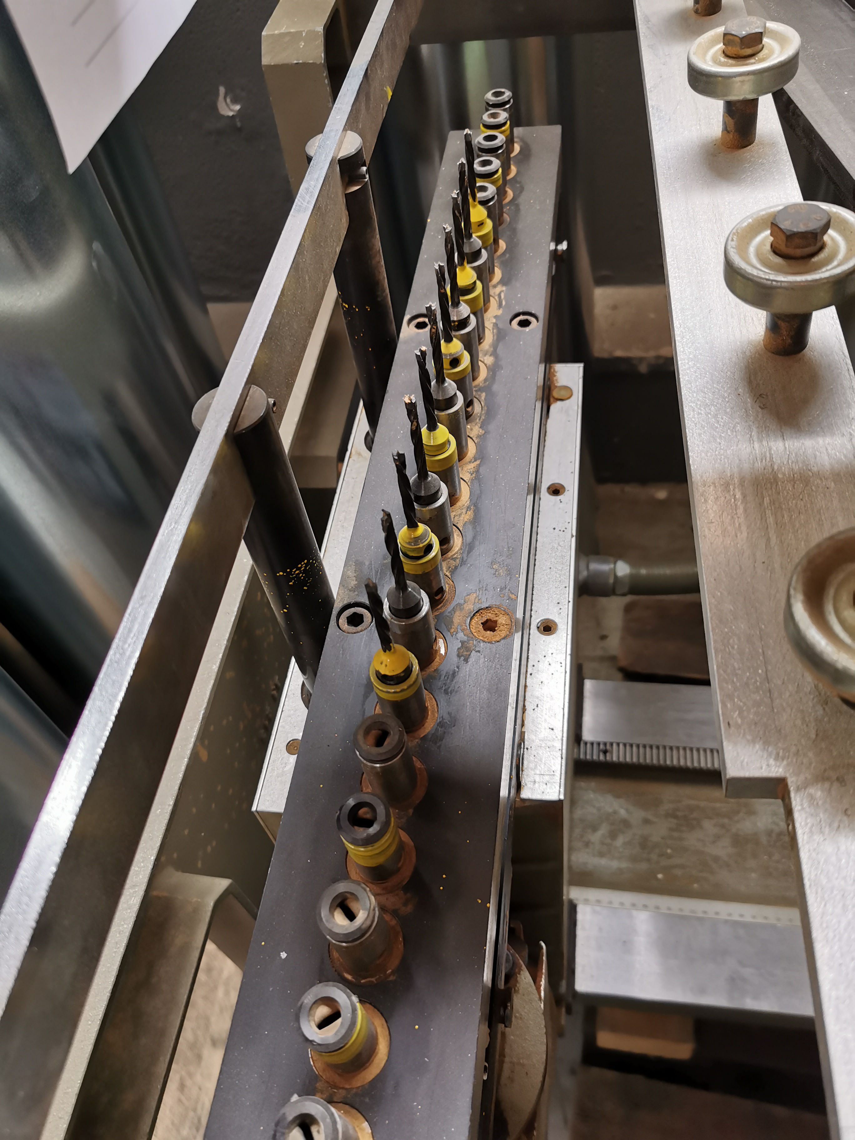 mit 21 Spindel, jeweils mit 11 Stück Ø 5 mm Bohrern mit Spitze bestückt