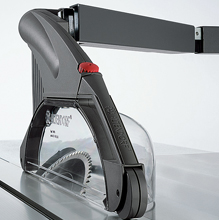 Die große Altendorf Schutzhaube überzeugt durch eine strömungsoptimierte Konstruktion. Mit wenigen Handgriffen lässt sie sich von breit auf schmal umstellen. Die Haube ermöglicht eine max. Schnitthöhe von 125 mm (unabhängig vom Vorritzaggregat) und ist komplett seitlich wegschwenkbar.