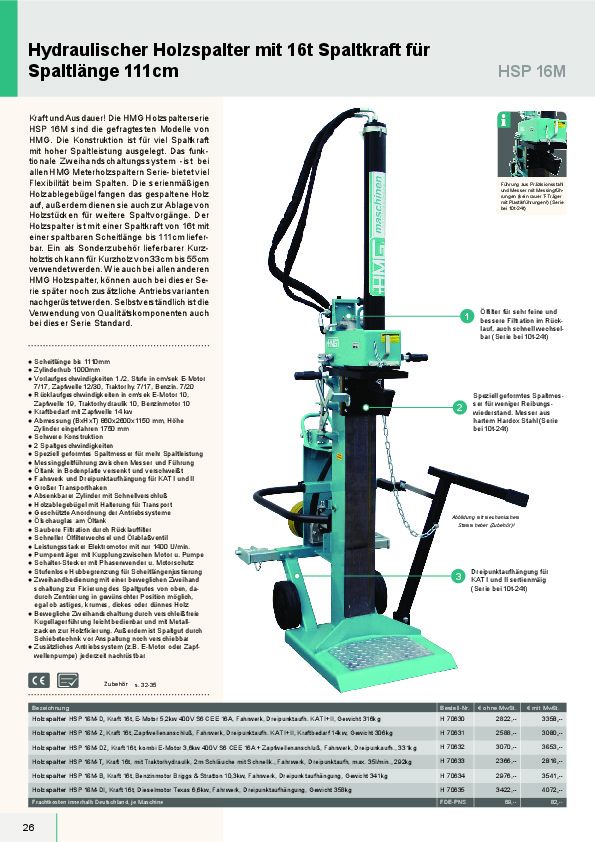 | Holzspalter Typ | HSP 16M-D | HSP 16M-Z | HSP 16M-DZ | HSP 16M-T | HSP 16M-B |