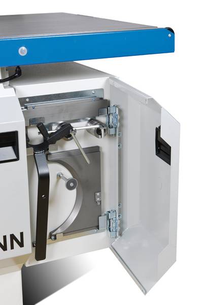 Elektrische Ausrüstung nach VDE/EN 60204 mit Hauptschalter, Not-Aus-Taster, Motorschutz und Wicklungsschutz, Unterspannungsschutz, Kontakt zum Ansteuern der Absaugung, Bremseinrichtung