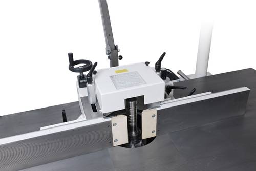 Fräsanschlag Typ 2601 Effizient mit Gesamtverstellung über Handrad nach Digitalzähler und Backenfeineinstel-lung der Einlaufbacke über Zylinderdrehknopf, mit Nonius. Drehbar um 360°; Gussanschlagbacken 500 / 500 mm mit Aufnahme für Sicherheitslineale und Kehlbrett. Werkzeug-Ø max. 250 mm.