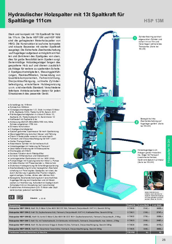 Solide und Stark! HMG Holzspalter mit 13t Spaltkraft für Meterholz bis 111 cm. Die Serie HSP 13M haben eine neu entwickelte Sicherheits-Zweihandschaltung. Das neuartige System ermöglicht universelles Halten und Zentrieren des Spaltgutes von oben, auch Schiebetechnik ist möglich. Die serienmäßigen Holzablegebügel fangen das gespaltene Holz auf, außerdem dienen sie auch zur Ablage von Holzstücken für weitere Spaltvorgänge. 2 Spaltgeschwindigkeiten, Messinggleitführungen, Rücklauffiltration, Verwendung von Qualitätskomponenten, Fahreinrichtung, Dreipunktaufhängung, schnelle Zylinderbefestigung, einstellbare Hubbegrenzung u.v.m. sind Standard. Verschiedene lieferbare Antriebsvarianten bieten für jeden Einsatzzweck das passende Gerät.