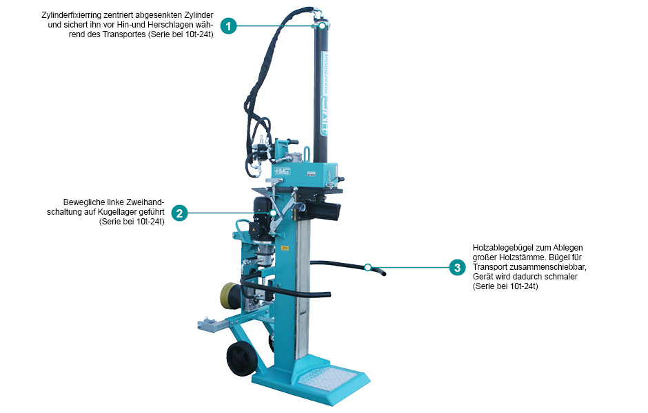 - Zweihandbedienung mit einer beweglichen Zweihandschaltung zur Fixierung des Spaltgutes von oben, dadurch Zentrierung in gewünschter Position möglich, egal ob astiges, krummes, dickes oder dünnes Holz