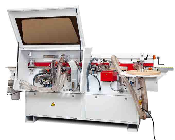 Einseitige automatische Kantenanleimmaschine mit Fügeaggregat, Schmelzkleberangabe an gerade Werkstücke, HF-Kappsägestation, HF-Fräsaggregat, Eckenkopieraggregat, Kettenvorschub, Doppelrollenoberdruck und Werkstückauflageschiene. Für ABS, PVC, Melamin und Starkholzfunier-Rollenmaterial, sowie Fixlängen, von 0,4 – 2,0mm und von 8 – 40mm Werkstückhöhe.