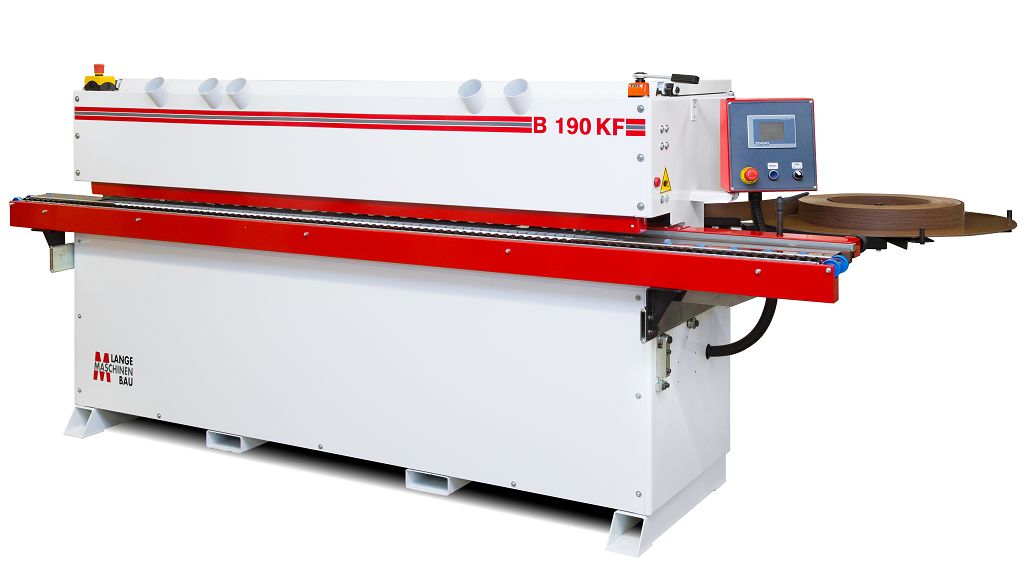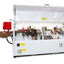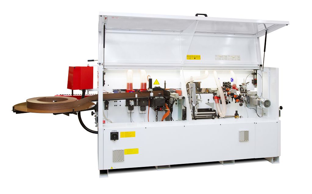Einseitige automatische Kantenanleimmaschine mit Fügeaggregat, Schmelzkleberangabe an gerade Werkstücke, HF-Kappsägestation, HF-Fräsaggregat, Kettenvorschub, Doppelrollenoberdruck und ausziehbare Werkstückauflageschiene. Für ABS, PVC, Melamin und Starkholzfunier-Rollenmaterial, sowie Fixlängen von 0,4 – 6,0 mm und Werkstückhöhen von 10 – 60 mm.