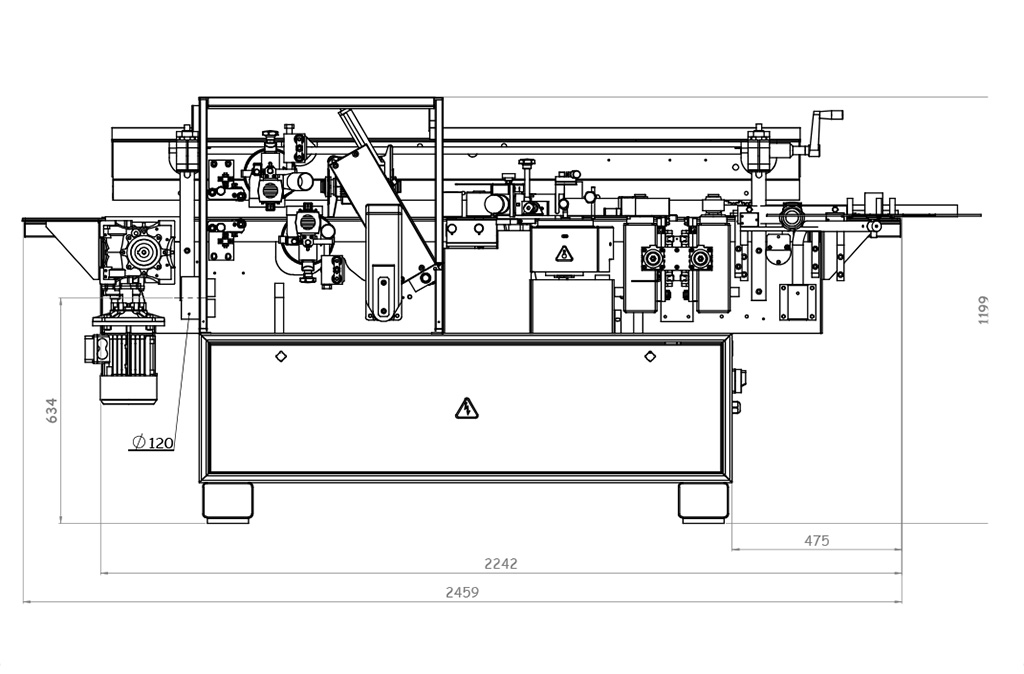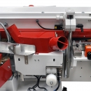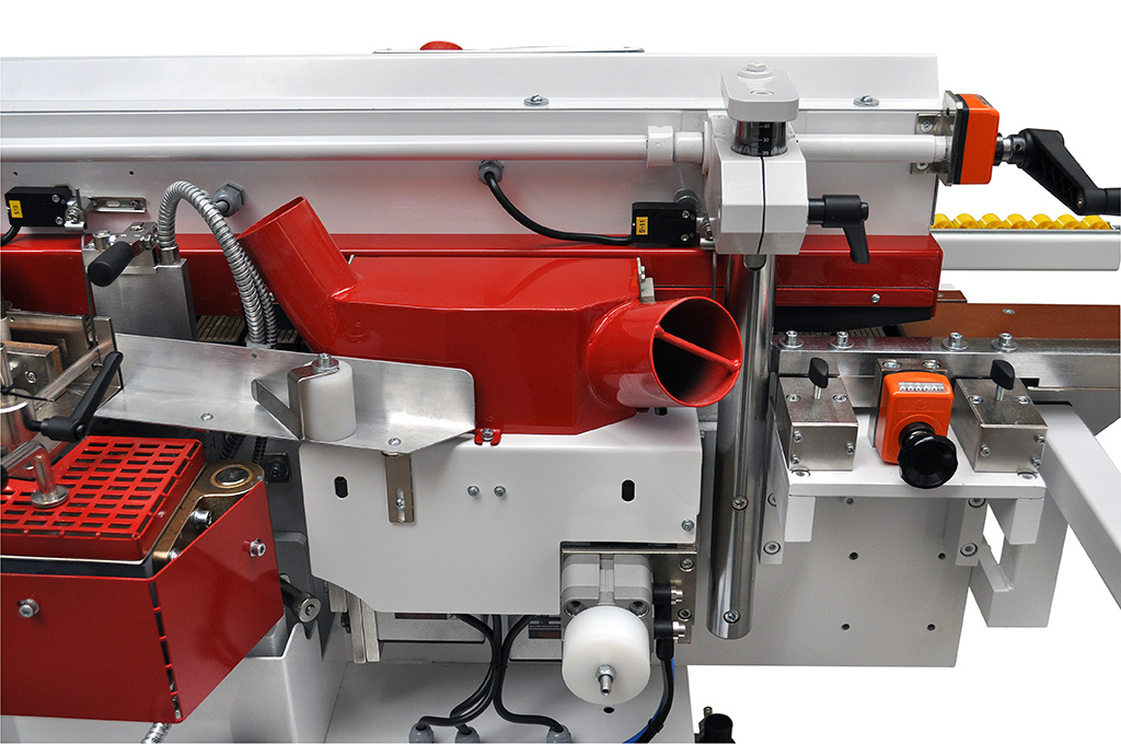 - Hochfrequenz Kombi-Frässtation, 2 leistungsstarke 0,27 kW Hochfrequenz-Motoren mit HM-WPL Spezialfräsern, geeignet für Radius- und Fasenfräsen,horizontale und vertikale Abtastung des Werkstückes, Aggregatverstellung ausgestattet mit Digitalzählern zur Einstellung auf unterschiedliche Kantenarten, 2 Späneabsaughauben mit zentralem Absaugstutzen Ø 120mm, Höhenverstellung des oberen Aggregates mit dem Oberdruck