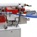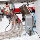 - Fügeaggregat – zwei gegenläufig, einsatzgesteuert arbeitende Fügeaggregate mit Spiralfügefräsern sorgen für ein sauberes und ausrißfreies Fügen der Werkstücke vor dem Anleimen der Kante