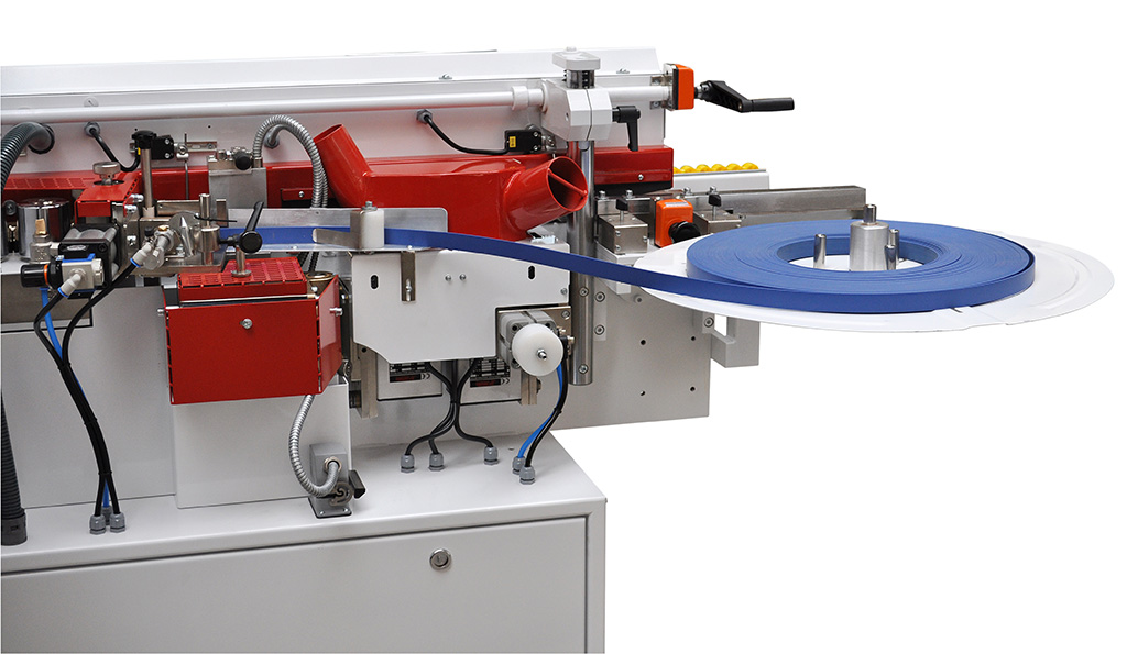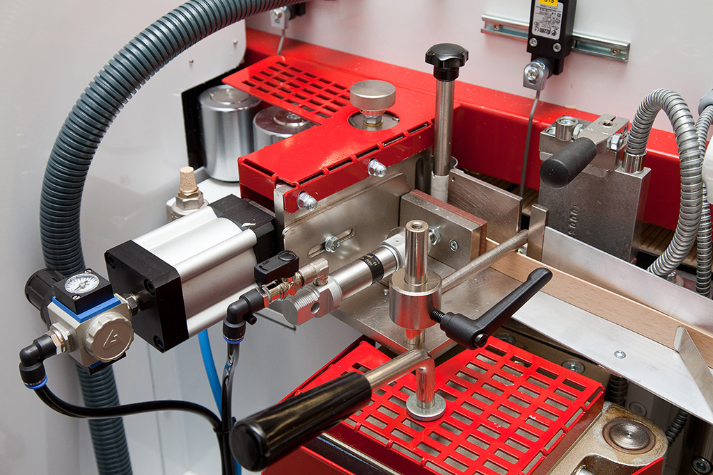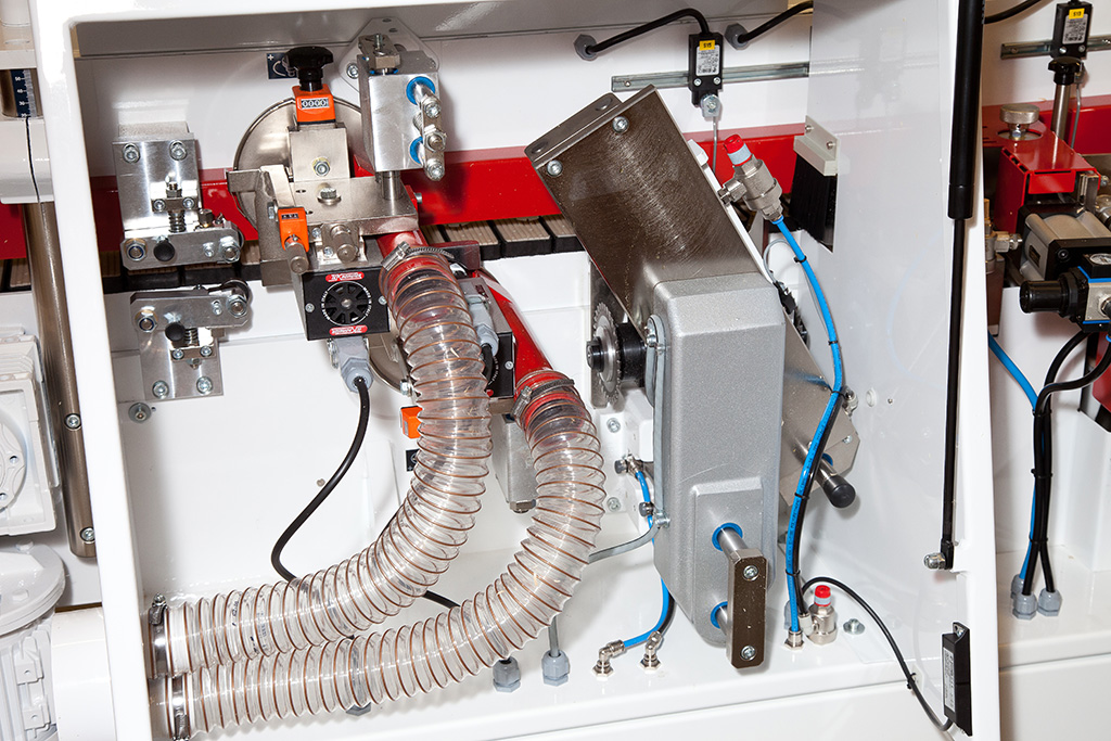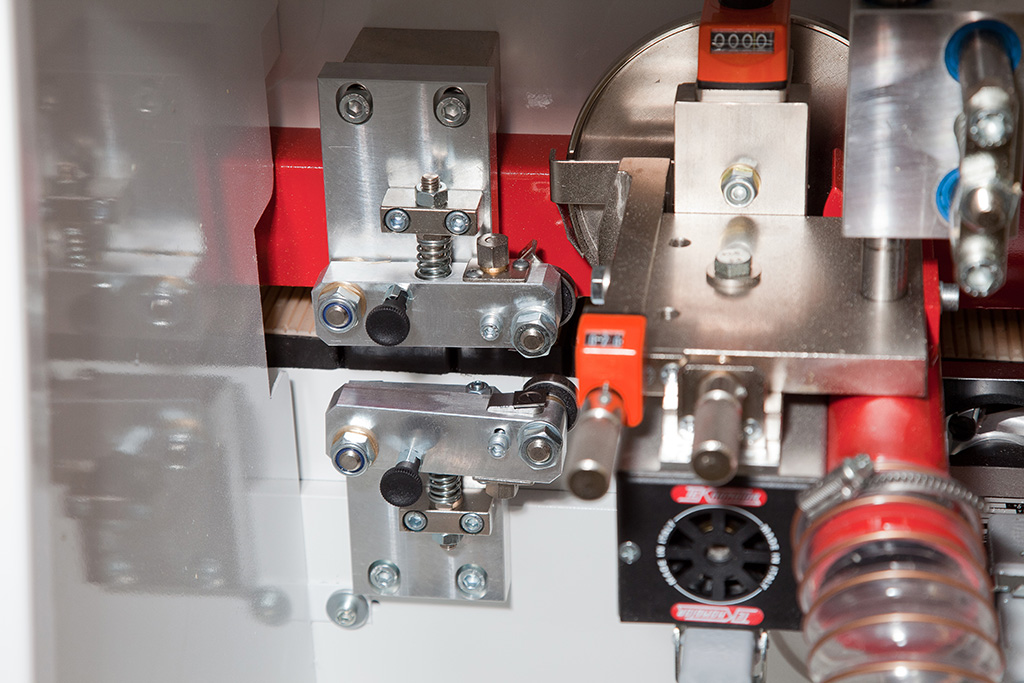 - Andruckzone bestehend aus einer angetriebenen Andruckrolle im Synchronlauf mit der Leimwalze und einer einstellbaren Anpressrolle mit Federspannung für eine gute Fugenbildung des Kantenmaterials mit dem Werkstück