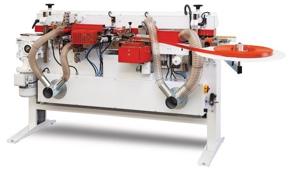 Einseitige automatische Kantenanleimmaschine mit Fügeaggregat, Schmelzkleberangabe an gerade Werkstücke, Bündigkappaggregat, HF-Fräsaggregat, Kettenvorschub, Doppelrollenoberdruck und Werkstückauflageschiene. Für ABS und PVC Rollenmaterial, sowie Fixlängen von 0,4 – 2,0mm und von 8 – 40mm Werkstückhöhe.