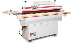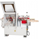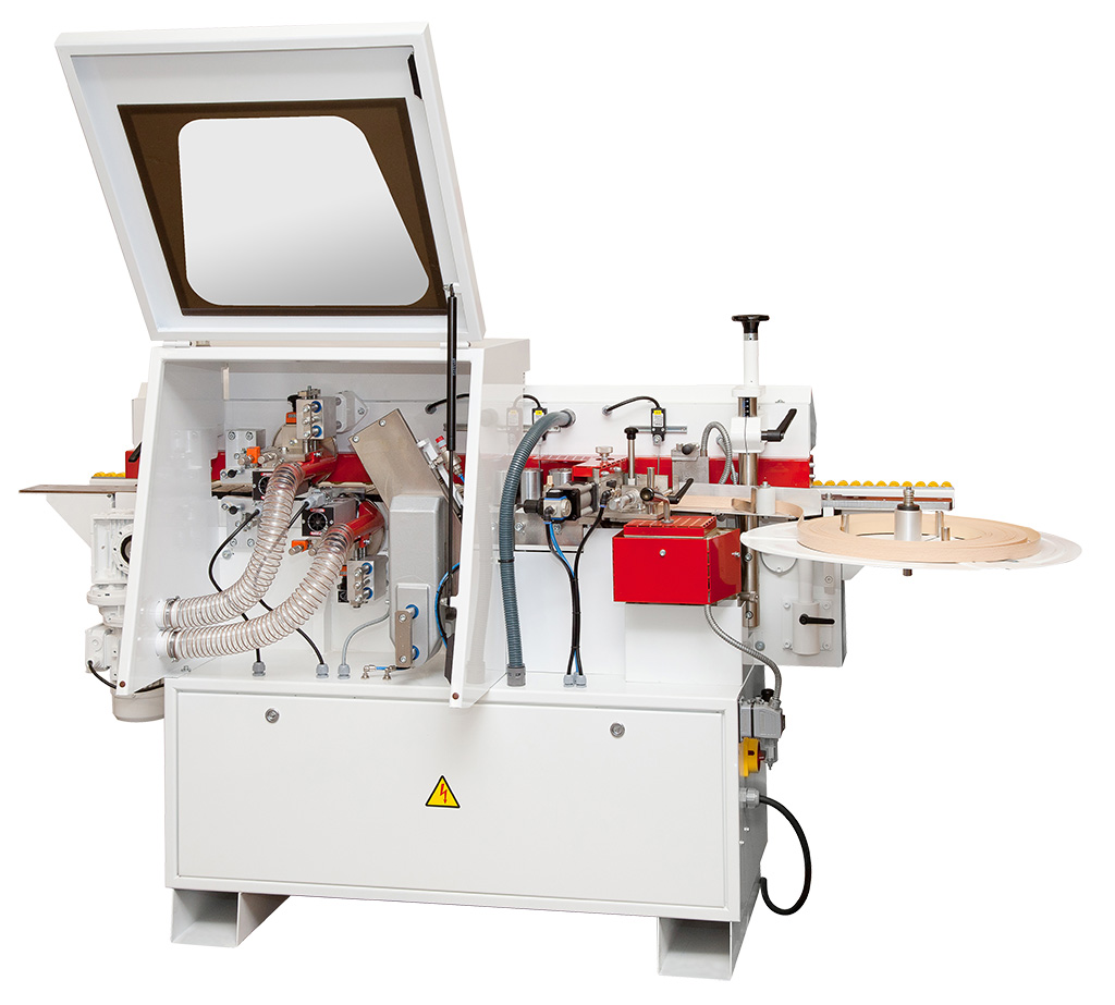 Einseitige automatische Kantenanleimmaschine mit Schmelzkleberangabe an gerade Werkstücke, HF-Kappsägestation, HF-Fräsaggregat, Kettenvorschub, Doppelrollenoberdruck und Werkstückauflageschiene. Für ABS, PVC, Melamin und Starkholzfunier-Rollenmaterial, sowie Fixlängen, von 0,4 – 2,0mm und von 8 – 40mm Werkstückhöhe.